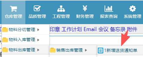 操作步骤:仓库管理——物料出库管理——销售出库管理——新增送货通知单;