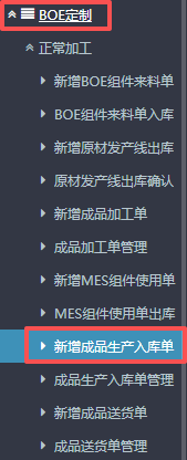 点晴ERP-BOE生产成品加工单流程 进入ERP系统之后,在左侧的功能菜单里找到“BOE定制”,点开“正常加工”,点击“新增成品加工单”。 2.进入界面后,按图操作:选择订单来源,备注有需要可补充。 3.接下来在下方找到“货品编码”点开,会有物料信息弹窗。 在弹窗的信息窗口内,按图操作:点击选择物料大类,点...