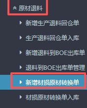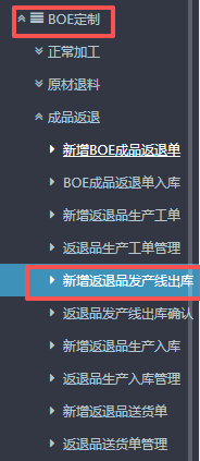 点晴ERP-BOE返退品生产入库流程 1.进入ERP系统之后,在左侧的功能菜单里找到“BOE定制”,点开“成品返退”,点击“新增返退品生产入库”。 2.进入界面后,按图操作:选择对应的订单子类型(正常返退品、制损品),然后选择对应入库仓库。 3.接下来下方点击“货品编码”,会弹出物料信息窗口。 在弹窗的...