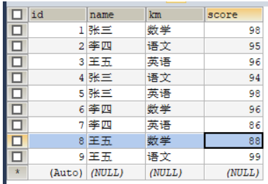 select NAME,SUM(CASE WHEN km='数学' THEN score END) AS '数学',SUM(CASE WHEN km='语文' THEN score END) AS '语文',SUM(CASE WHEN km='英语' THEN score END) AS '英语' from student GROUP BY NAME