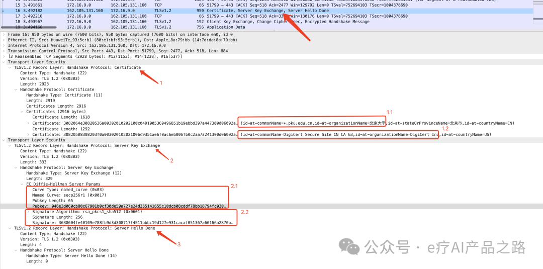 • Certificate:服务端证书和证书相关的扩,如果不使用证书进行身份验证,则服务器会省略此消息;如果使用原始公钥[RFC7250]或缓存的信息扩展[RFC7924],则此消息将不包含证书,而是包含与服务器的长期密钥对应的其他信息