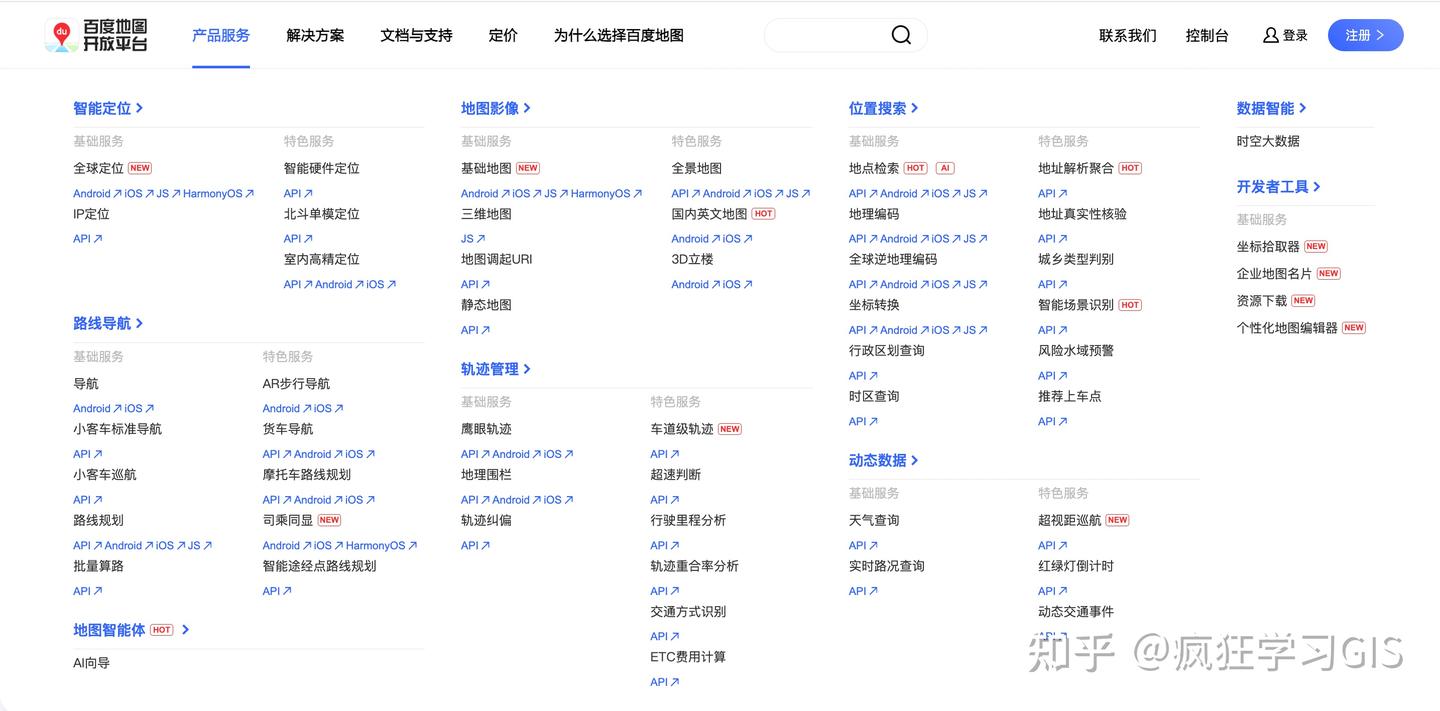 可以看到,百度地图开放平台的功能是几家中最丰富的,提供了包括定位、导航、遥感数据、轨迹、位置搜索、动态数据等地图服务工具;且还提供了具有智能分析作用的时空大数据模块、地图智能体等,是几家不同地图API中,对时空智能分析、AI技术等最早加以应用的厂商之一。总的来说,百度地图开放平台对于开发者而言可以说满足了几乎全部的地图服务需求。