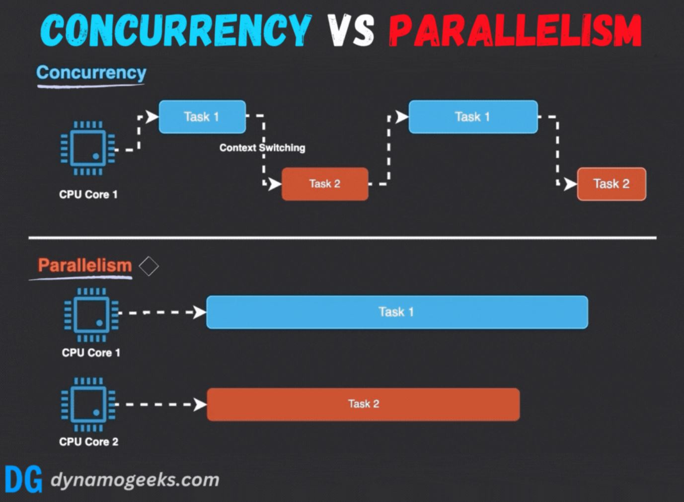 - 硬件依赖:并行需要多处理器或多核心支持,而并发在单核系统上即可实现。