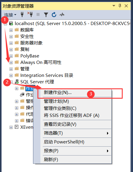 本节讲解如何在SQL Server Management Studio(SSMS)中创建一个SQL Server代理作业,并在计划中运行它。(创建作业(包括其他组件,计划、警报等等)的方式有很多,可以用SSMS图形化操作,可以用Transact-SQL脚本操作,也可以用SQL Server Management Objects操作,这边介绍SSMS图形化操作,该方式比较通用直观)