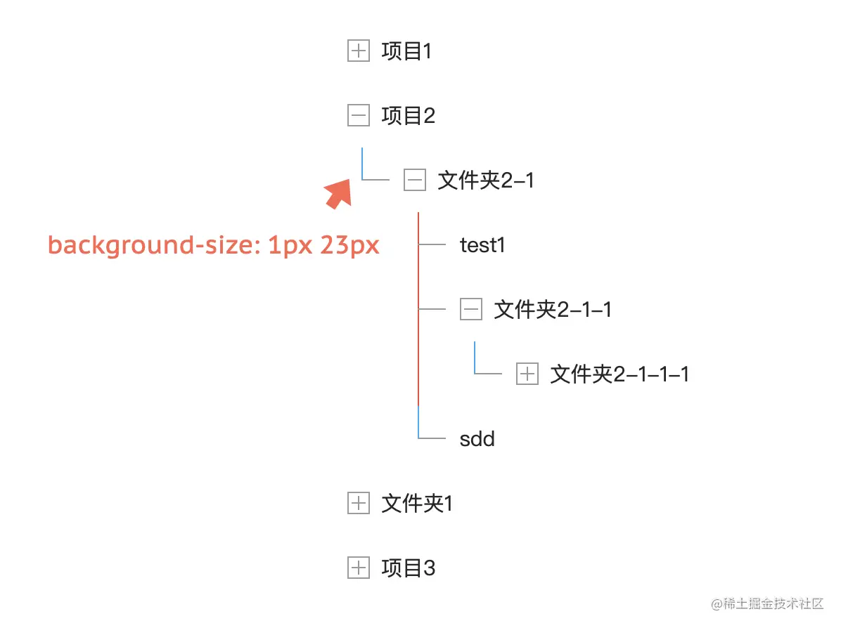 直接绘制可能有些难度,我们可以分解开来,一部分是垂直的,指向树的每个标题部分,所以直接绘制在summary上,还有一部分是竖直的,并且竖直部分会包含整个展开部分,因此可以把线条绘制在details上,用代码实现如下(为了区分,下面把垂直部分用红色表示)