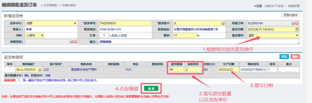 3.点击编辑进入页面后,按图操作:根据情况选择退货操作(退款、补货),填写退货数量、含税单价以及日期。点击编辑