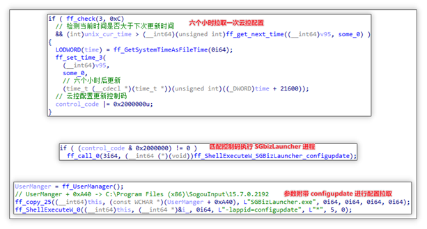 配置拉取源头:搜狗输入法将会借助 SGBizLauncher.exe 程序附加参数 -lappid=configupdate 进行拉取云控配置,该SGBizLauncher.exe 程序会被输入法组件 SogouPY.ime 执行,执行间隔为六个小时一次。此输入法组件为 DLL 文件,将会通过用户切换至搜狗输入法时被加载。