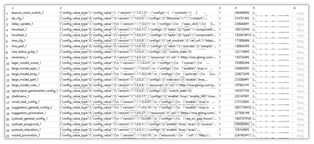 上图为分析测试场景下的云控配置与本地数据库对应关系图,下图为搜狗输入法真实用户场景下的云控配置对应的数据库图,其中 smart_task_config_1 所对应的 JSON 数据内包含推广模块下载地址。