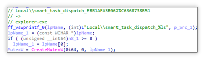 为了防止多次运行,它会创建互斥体 Local\\smart_task_dispatch_{被加密的进程名}。