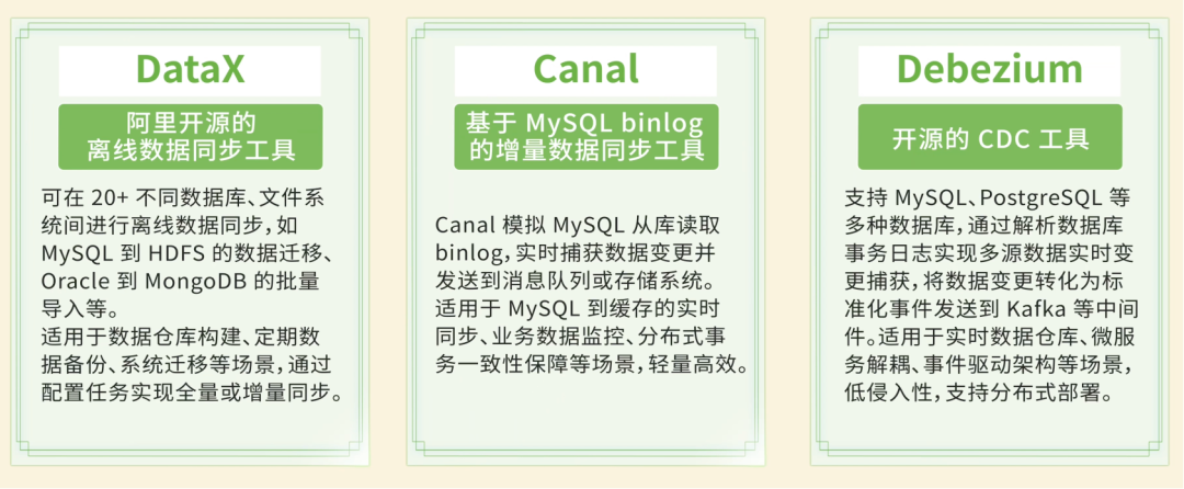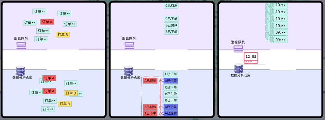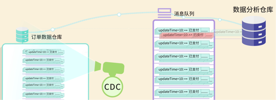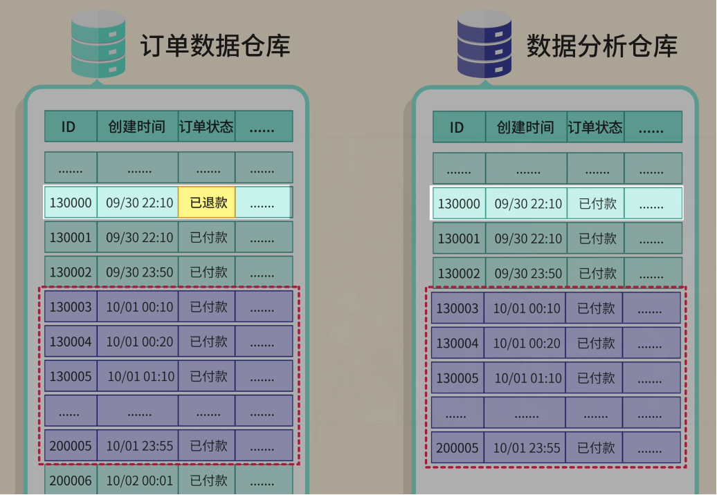查询结果返回订单 A(08:00)和订单 B(09:00),同步完成后将偏移量调整为下一页 可就在查询下一页前,订单 B 因为 “修改订单状态” 被更新,这时订单 B 的更新时间就不在查询范围内了。 这就导致查询下一页 ![]() 怎么解决这个问题呢? 这可难不倒你小阿巴,既然 动态数据集 中使用 SQL 自带的 OFFSET 偏移作为分页起点会出问题,那不妨 自定义一个标志来记录下一批要同步的起点。 这就是游标机制。 比如我约定自增的主键 id 作为游标,每查询一批数据之后,把这批数据的最后一条记录作为新的游标值;查询下一批数据时,只查询 id > 游标的数据。 ![]() 这样不仅防止数据丢失,还避免了 OFFSET 深度分页带来的性能问题。 此外,如果把游标想象成进度条的断点,可以更清晰地记录同步进度,失败后可以从断点继续。 做完这一通优化后,你长吁了一口气,工作看来是保住了。 ![]() 性能优化你以为终于可以安稳一段时间了。但没想到,公司的好日子才刚刚开始。 随着老板大力扩张业务,公司每天的订单量可以达到百万条,你的同步任务每次要跑几个小时才能完成。 更要命的是,老板现在对数据的依赖越来越强,要求每隔 2 个小时就要同步一次数据! 怎么能够让任务执行更快呢? 这时,你想起了曾经在 程序员面试神器 - 面试鸭 上背过的各种性能优化八股文。好家伙,终于能派上用场了! ![]() 首先,修改插入数据库的操作方式。之前是一条一条地插入订单数据,改为执行一条批处理语句来同时插入同一批内多个订单数据,减少了跟数据库通信的次数,性能大幅提升。 ![]() 但是你觉得还不够快,于是优化了批处理的流程。之前是等一批同步完再同步下一批,串行执行;现在你启动了多个线程,每个线程负责处理一批订单的同步,多个线程可以同时搬砖干活,效率大幅提高。 ![]() 这一通操作下来,老板都激动了:“小阿巴,你这技术可以啊!好好干,我给你升职加薪!” 你笑了,有了老板这句话,你想继续努力给公司卖命了。 ![]() 实时同步两年后,随着你头发的消逝,公司总部决定要上市了! ![]() 老板找到了你:“阿巴阿巴,咱们的数据同步能不能做到实时?我想给投资人展示实时的业务监控。最好是用户刚下单,投资人立刻就能在大屏幕上看到!" ![]() 你早料到会有这个需求,帅气地甩出一句话:“交给我吧,我让你见识一下企业级方案!” ![]() 这两年你也没闲着,像实时数据分析这种典型需求的实现方案,你早已烂熟于心。 普通的定时任务已经无法满足实时性的要求,只能搬出 CDC + 消息队列 这两大杀器了。 CDC(Change Data Capture)就像给数据库安装了一个 24 小时实时监控的摄像头,数据有任何变化,摄像头都能立刻发现。 消息队列就像一个快递中转站。数据库变化的消息先发送到这个中转站,然后同步数据的程序从中转站取出数据并写入到数据分析仓库中。 ![]() 有了中转站后,如果消息特别多,程序来不及处理,也不会丢失数据。 实现了这套方案之后,用户只要一下单,100 毫秒内老板就能在仪表盘上看到。而且保险起见,你还给消息队列加了个监控,如果消息堆积太多,就会自动告警。 他开心得像个孩子:“小阿巴,我给你升职加薪,还给你带新人!” 你又笑了,开始幻想着你和新人坐在高高的办公桌上,你给他讲述自己光辉事迹,他向你投来羡慕的目光。 ![]() 方案完善半个月后,公司迎来了双十一大促活动。 你正在和新来的实习生阿坤吹牛皮,没想到瞬间产生了大量订单,像洪水一般,让你的实时同步系统出现了各种异常: