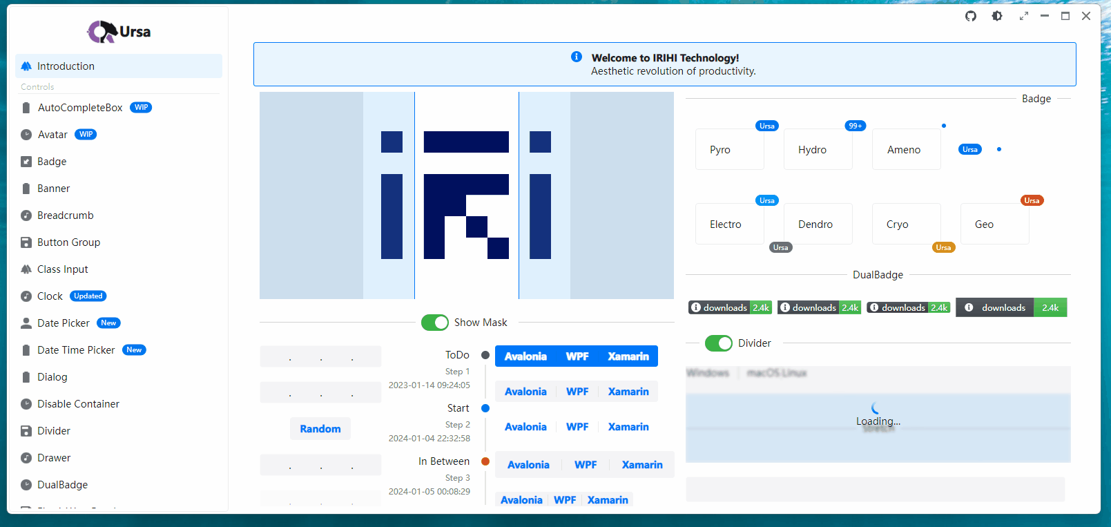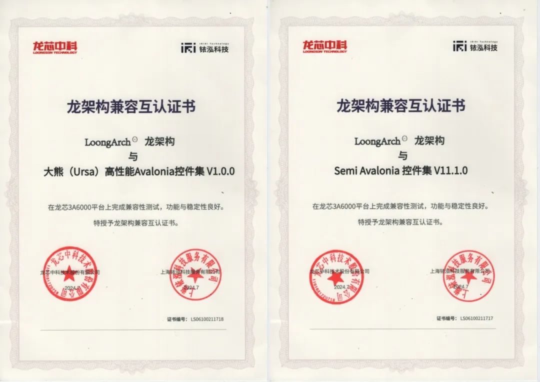 Avalonia是什么?Avalonia是一个强大的框架,使开发人员能够使用.NET创建跨平台应用程序。它使用自己的渲染引擎绘制UI控件,确保在Windows、macOS、Linux、Android、iOS和WebAssembly等不同平台上具有一致的外观和行为。这意味着开发人员可以共享他们的UI代码,并在不同的目标平台上保持统一的外观和感觉。 Dotnet和Avalonia都是MIT协议,相关的代码地址是: Semi.Avalonia和Ursa.Avalonia(一)Semi.Avalonia - 主题风格的魅力实现Semi.Avalonia,这是以 MIT 协议开源的 Avalonia UI 框架下的 Semi Design 主题风格的精妙呈现。它为应用程序带来独特的视觉风格,如同一幅精美的画卷,为用户界面增添了丰富的色彩和质感。 其仓库地址为:https://github.com/irihitech/Semi.Avalonia (二)Ursa.Avalonia - 自定义控件的创新力量搭配同样遵循 MIT 协议的Ursa.Avalonia自定义控件库,更是如虎添翼。它们携手为开发者缔造全新的视觉与功能体验,仿佛为开发之旅开启了一扇通往无限可能的大门。 仓库地址:https://github.com/irihitech/Ursa.Avalonia 在信创及国产操作系统领域表现值得一提的是,这两个库在信创及国产操作系统领域表现出色,已完成与龙芯 3A6000 和龙架构(LoongArch™)的兼容互认证,这是自主可控和国产化技术推进的重要成果。 下面信息引用来自微信公众号【铱泓科技】8月2号的文章 《Ursa与Semi正式完成龙架构兼容互认证》: