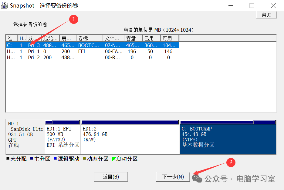 1、选择需要备份的分区,点下一步。