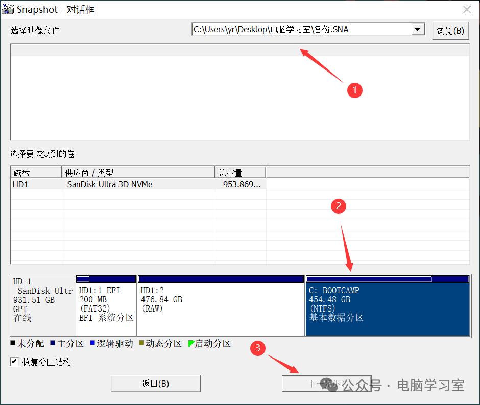 选择之前的备份镜像,选定需要还原的分区位置,点下一步按提示操作即可。