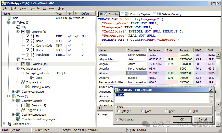 SQLiteSpy 是一款快速、轻量级的免费 SQLite 管理工具,提供了图形化的数据操作界面。