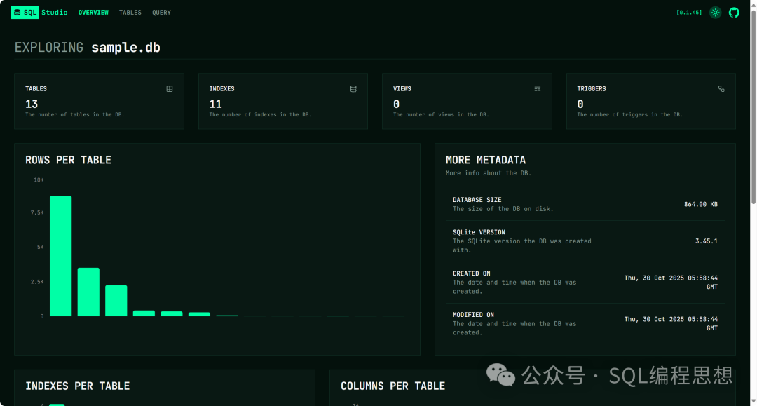 • • 表结构概览:TABLES 页面显示了每个表的具体信息,包括字段数量、索引数量、总行数以及表的大小。