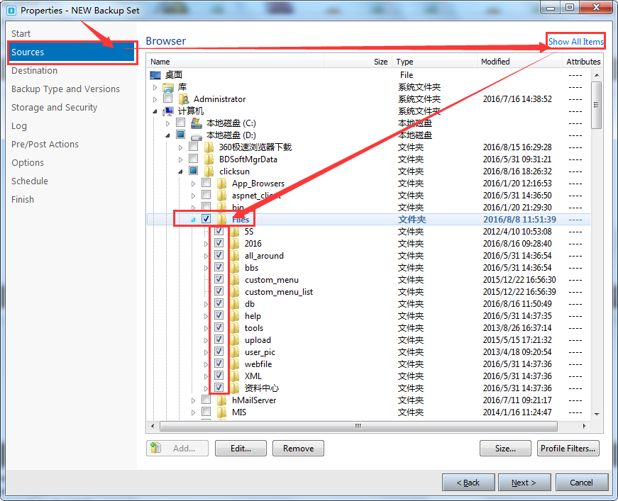 第二步,选择本机需要备份的文件,一般点晴系统备份clicksun文件夹下面的files文件即可如下图所示: