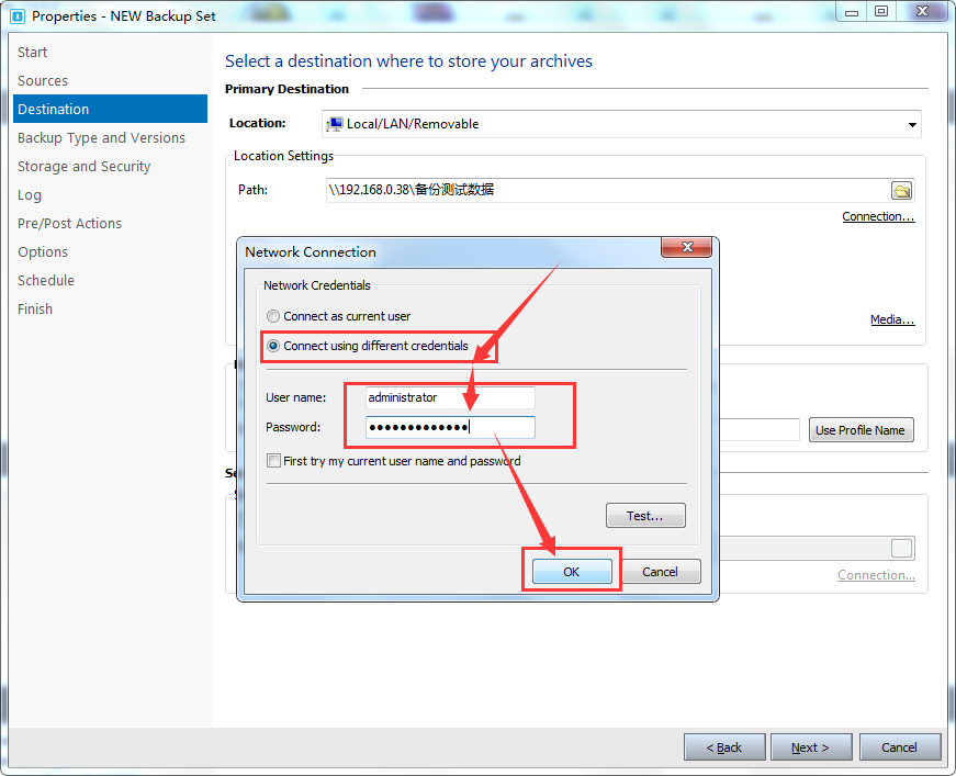第三步,选择目的地备份方式,支持本机、局域网内其他电脑共享目录、FTP等多种备份方式,下面以备份文件保存到本地局域网内其他电脑(192.168.0.38)共享目录为例,操作如下图所示: